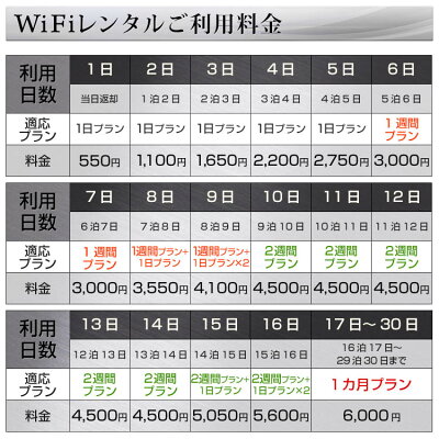広いカバレージで一晩の充電で6時間程度は継続使用可能… お客様レビューはこちら>> WiMAX2+ [NAD11]ご利用料金プラン 利用日数 1日2日3日4日5日6日7日 当日返却1泊2日2泊3日3泊4日4泊5日5泊6日6泊7日 レンタル料金 550円 1,100円 1,650円 2,200円 2,750円 3,300円→1Weekプラン適用3,000円 利用日数 8日9日10日11日12日13日14日 7泊8日8泊9日9泊10日10泊11日11泊12日12泊13日13泊14日 レンタル料金 3,550円 4,100円 4,650円→2Weekプラン適用4,500円 利用日数 15日16日17日〜30日 14泊15日15泊16日16泊17日〜29泊30日 レンタル料金 5,050円 5,600円 6,150円→1ヶ月プラン適用6,000円 WiMAX2+ [NAD11]レンタル利用料金具体例 お客様の元へレンタルWiFi端末が到着した日が【月内10日】で配達店舗にレンタルした端末を返した日が月内13日だとした場合… 利用日数が4日なので550円/日×4日=2,200円 レンタル日が6日を超えた場合 ⇒1Weekプラン適用 3,000円へ料金修正致します。